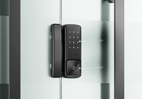 Fechadura inteligente de sobrepor para porta de vidro. Sua casa mais prática com liberação de acesso remoto, por senha e biometria. Mais conectividade com produtos de casa inteligente através do app Mibo Smart.
